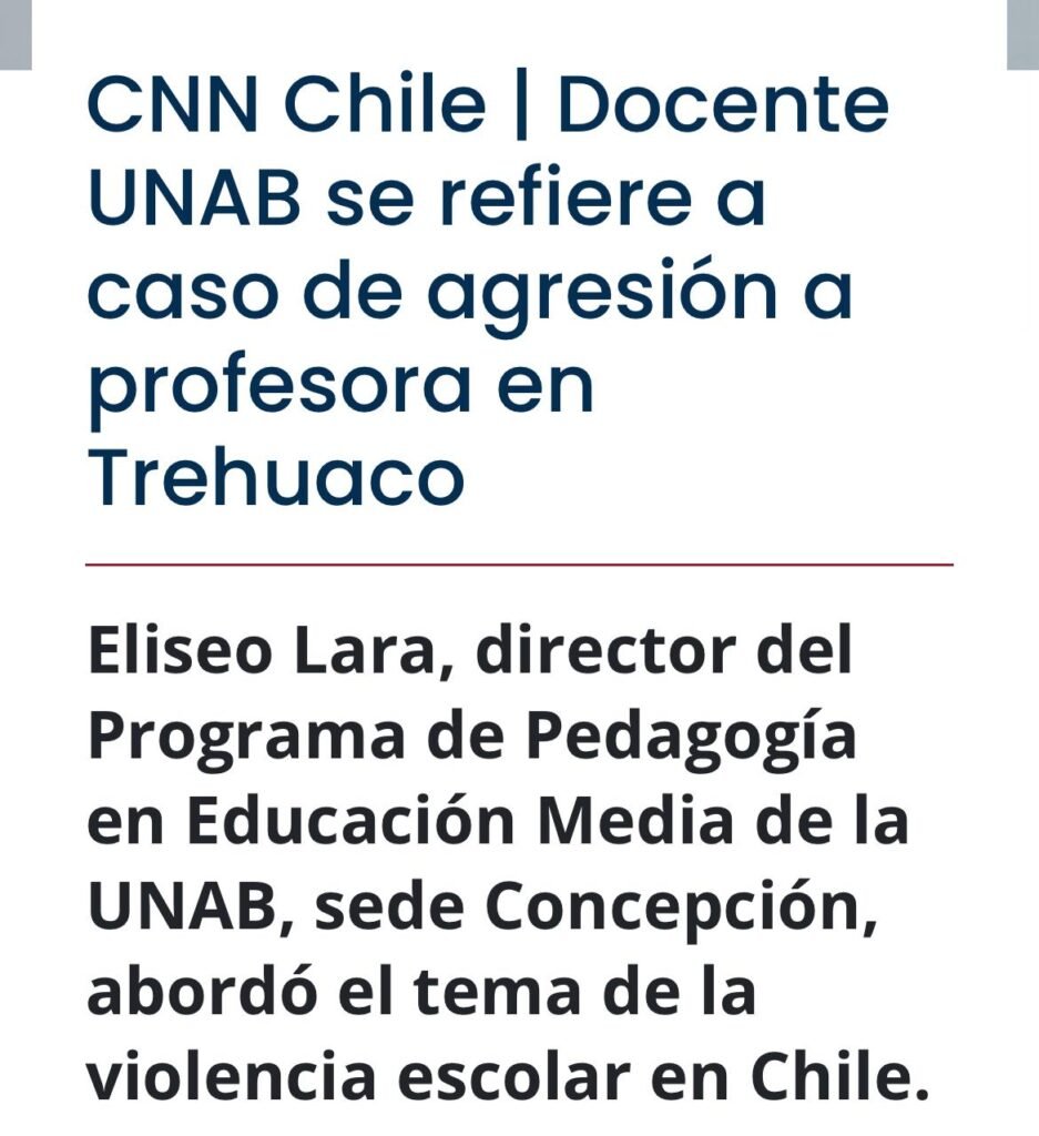 Un dato: en los últimos 10 años se han reportado más de 700 denuncias de agresiones a docentes de parte de alumnos. Desde la Universidad Andrés Bello (UNAB), el director del Programa de Pedagogía en Educación Media, sede Concepción, Eliseo Lara Órdenes, expresó en CNN Chile su parecer frente a este hecho y al escenario actual. «Los profesores y docentes no sienten que el establecimiento o su lugar de trabajo es un espacio seguro», dijo.«Eso es una situación alarmante y las cifras empujan la salida de los docentes”, afirmó.